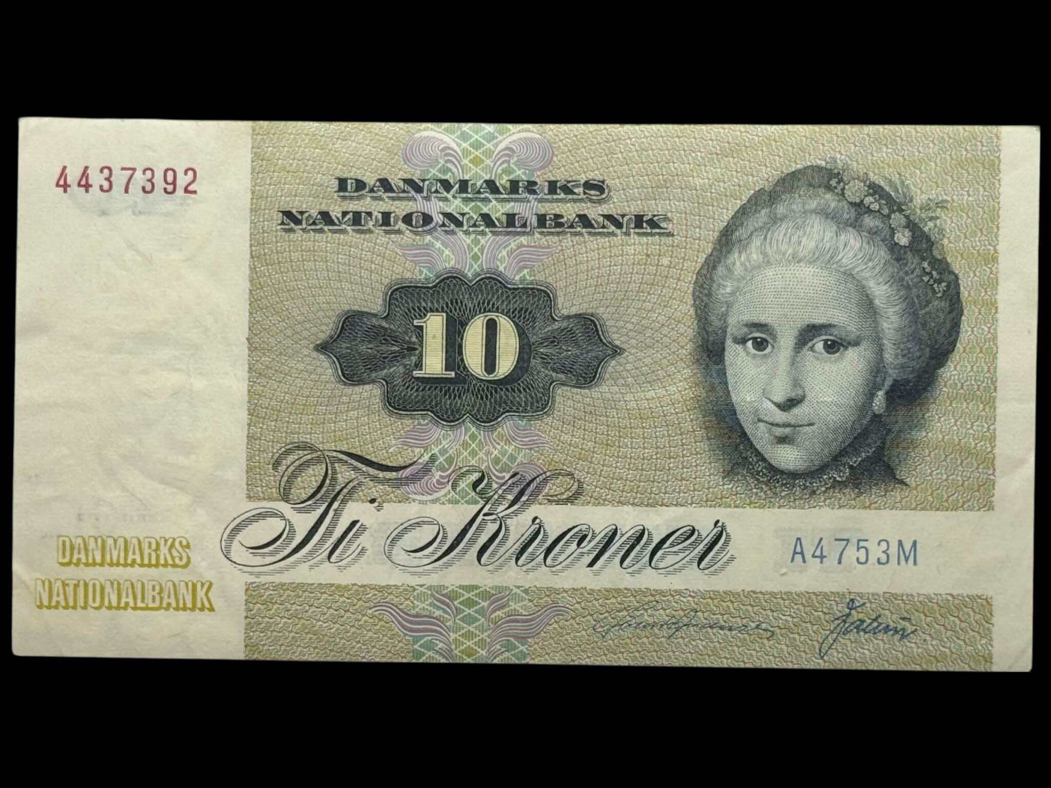 10 kroner 1975 A4, Valuer/Hoffmeyer, Lys sikkerhedstråd, Nr. 4437392, Sieg 139, DOP 148, Pick 48, Kva. 1+