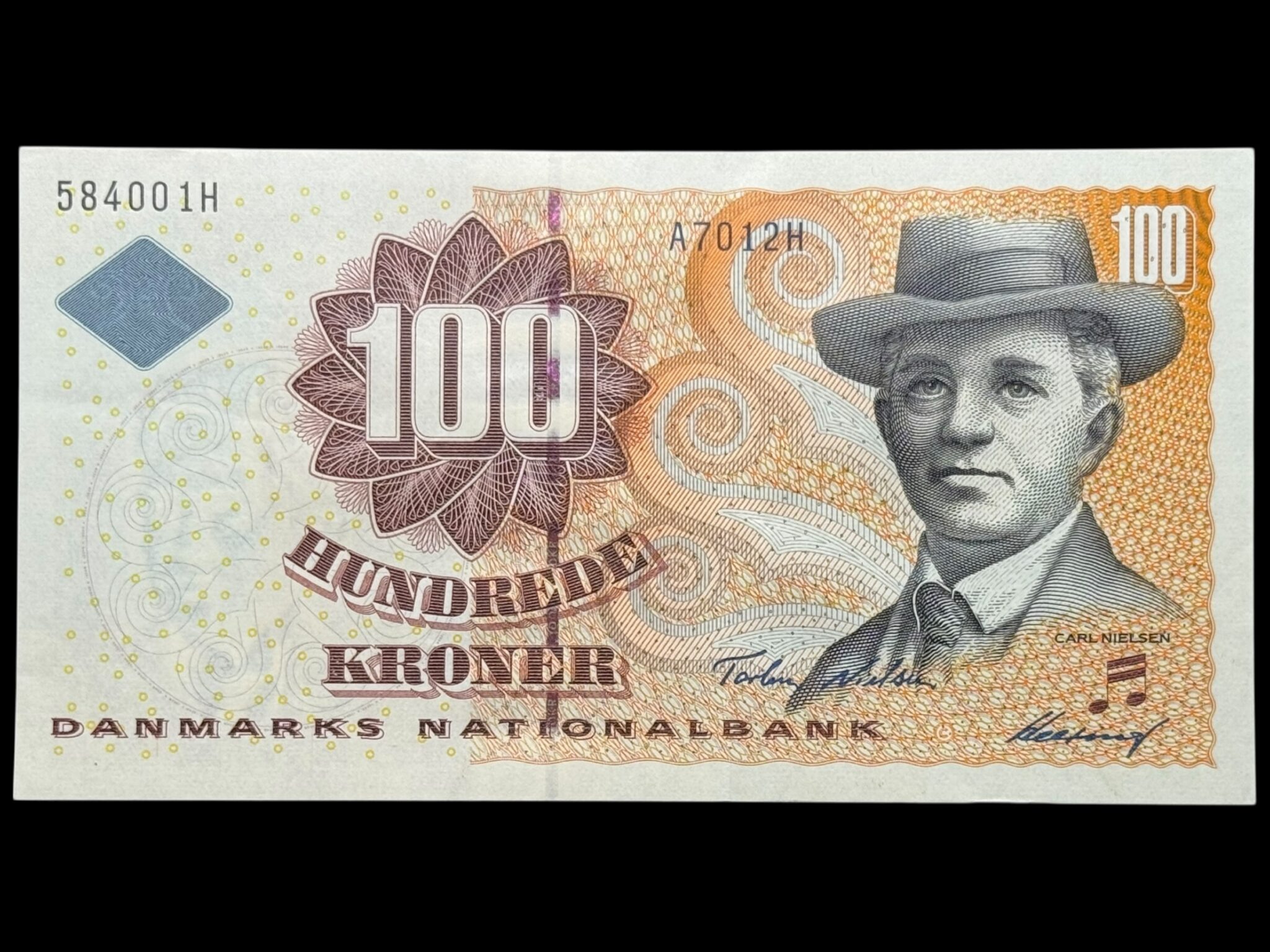 100 kroner 2001 A7, Heering/Torben Nielsen, Nr. 584001H, Sieg 147, Pick 56, Kva. 0