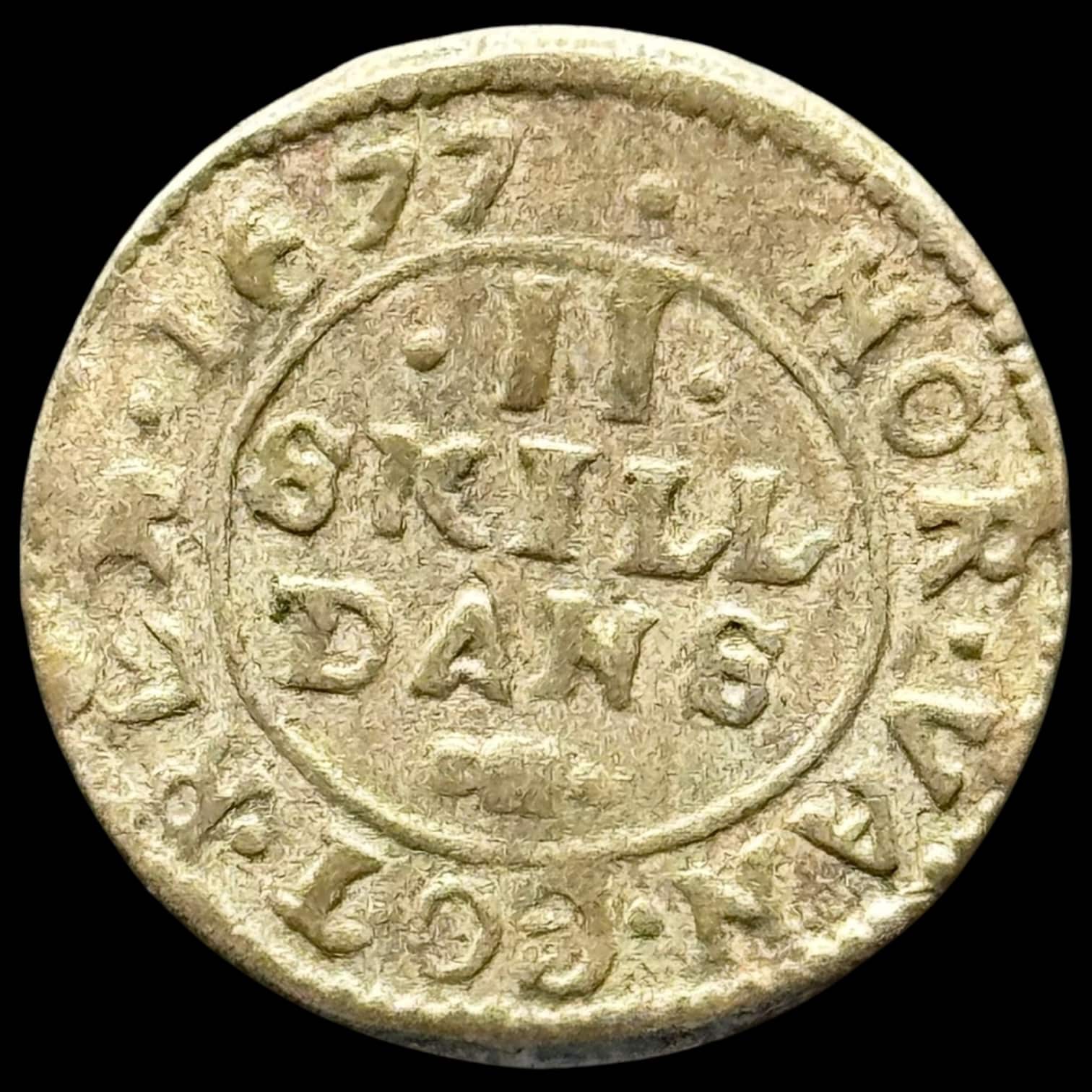 1677, 2 skilling, Chr.V, Sieg 7.1, Hede 74A, Kva. 1+ “Fejlpræg” spænende og uhyre sjælden fejlmønt, hvor præget rollen har være fejlcenteret, hvorfra 1 stjerne er at se uden for den originale motiv overflade