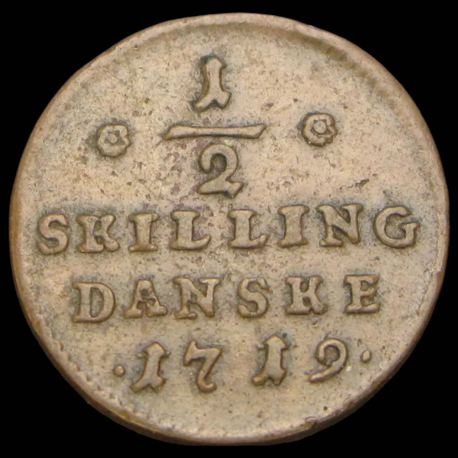 1719 1/2 skilling “lille skrift” Fre.lV Kva. 1+ “Sjælden”