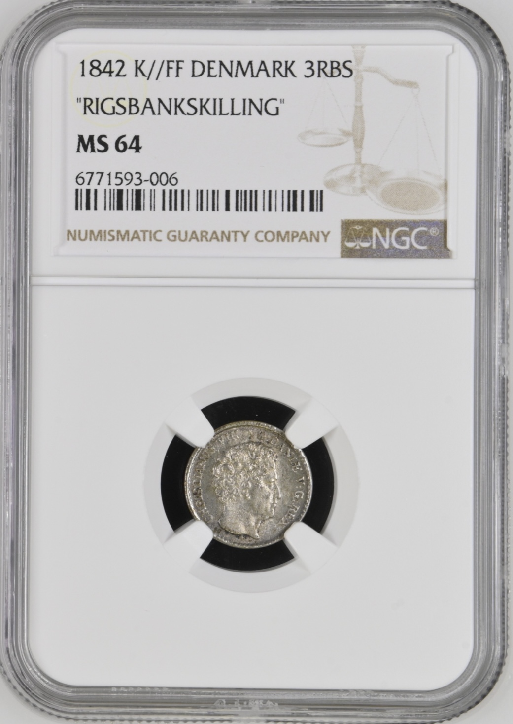 1842 FF, 3 Rigsbankskilling, Chr.VIII, Sieg 6, Hede 9A, Kva. 0, Graderet MS 64 af NGC