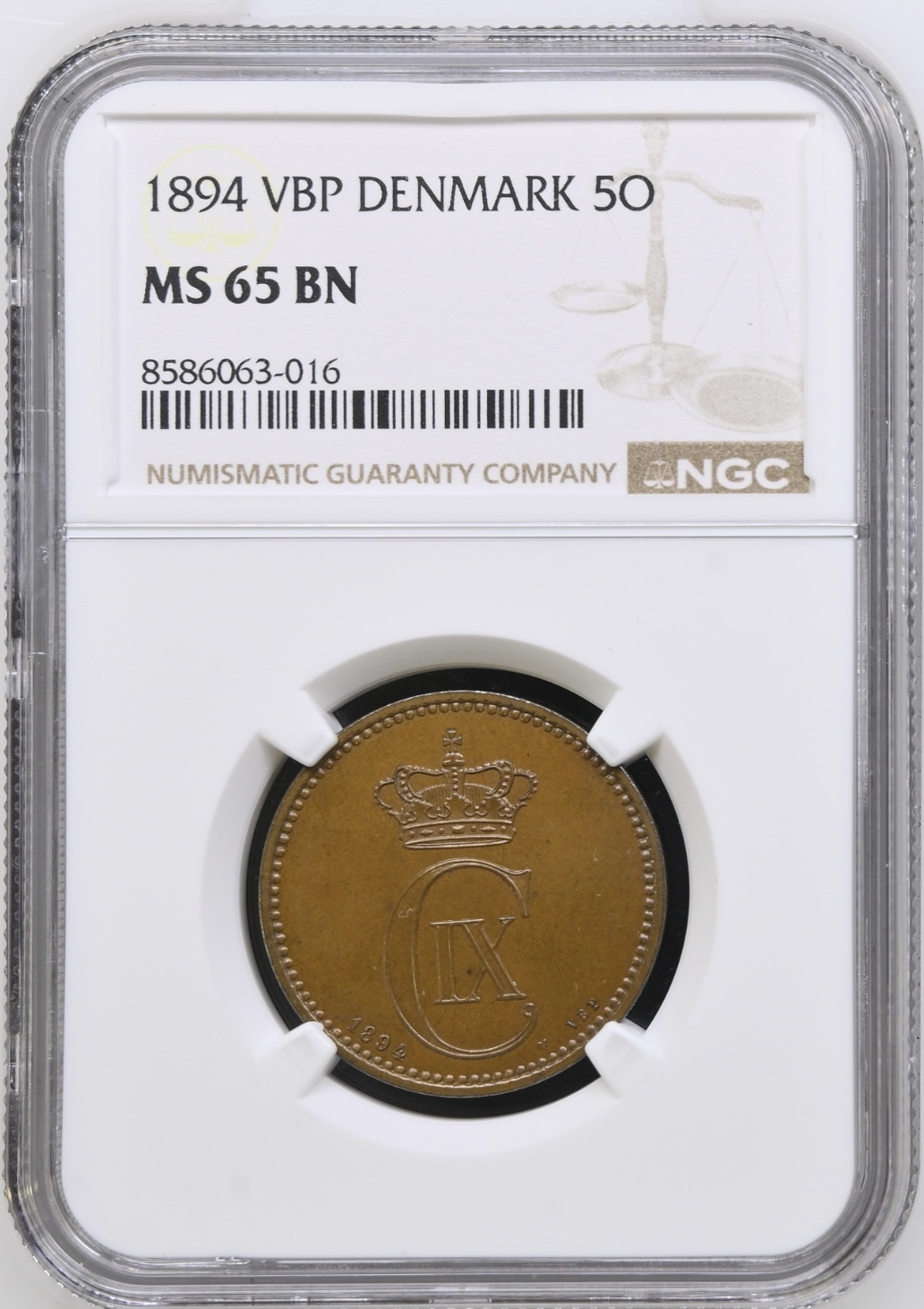 1894, 5 øre, Chr.IX, Sieg 1.2, Hede 17B, Kva. M, Graderet MS 65 BN af NGC.