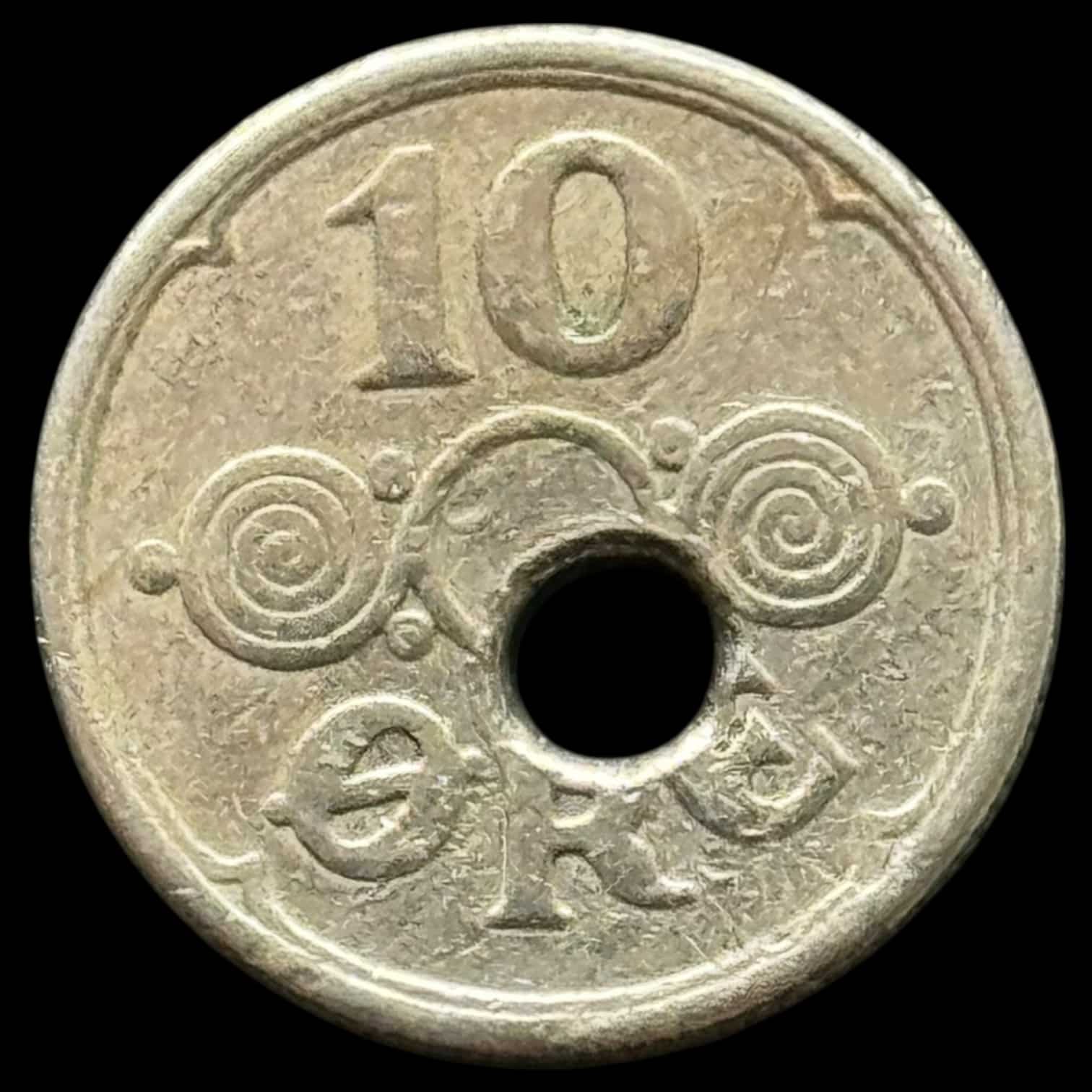 1924, 10 øre, Chr.X, Sieg 12.1, Hede 26A, Kva. 1 “Fejlpræg” Skævt præget hul