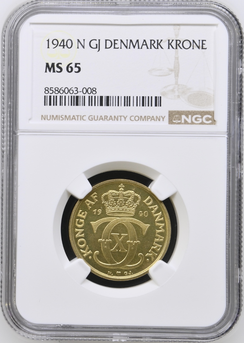 1940, 1 krone, Chr.X, Sieg 3.2, Hede 21B, Kva. M, Graderet MS 65 af NGC
