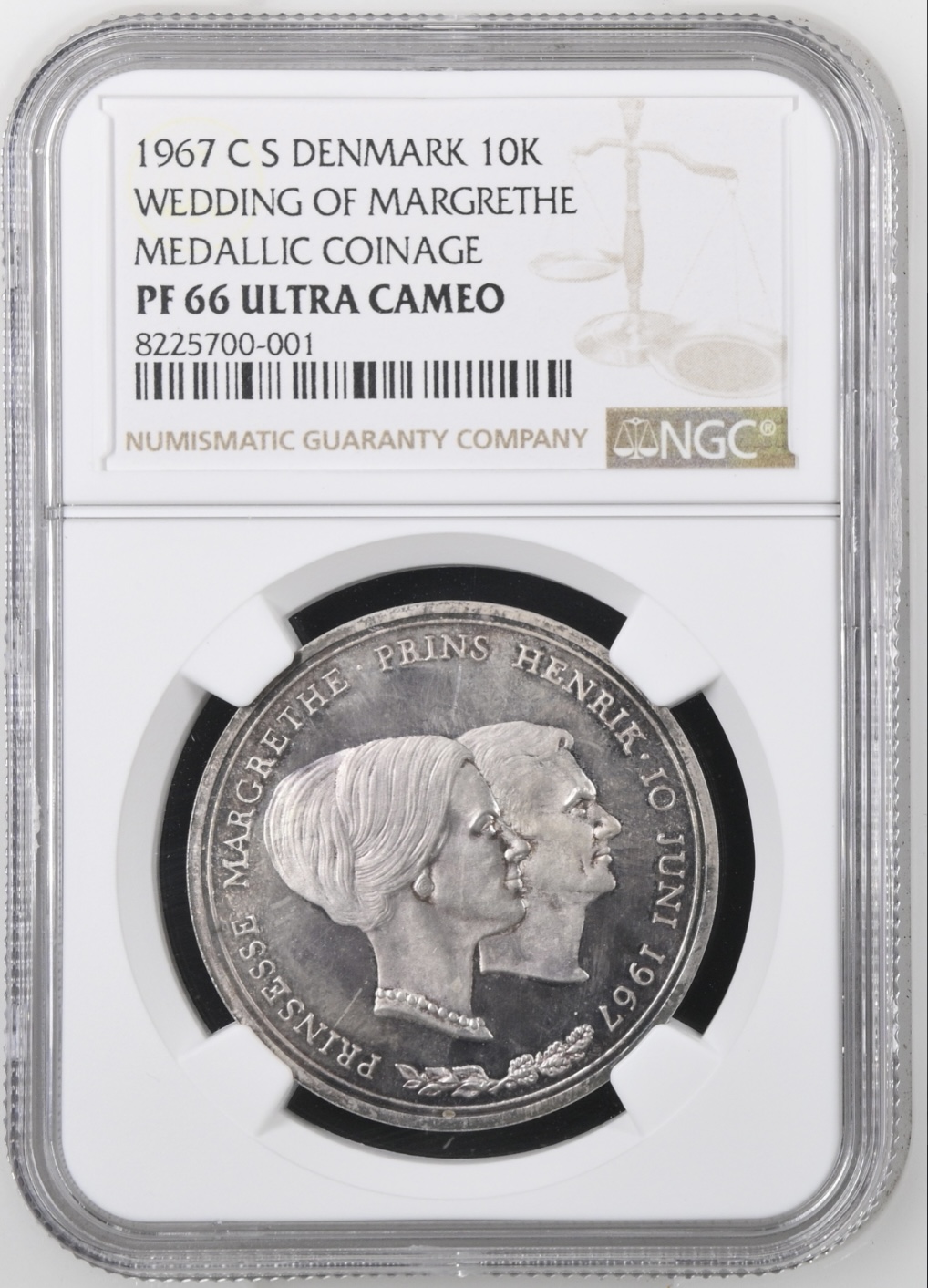 1967 Ministereksemplar, (10 kroner) Uden Værdiangivelse, Tronfølgeren Prinsesse Margrethes bryllup med Prins Henrik, Sieg 14, Kun lavet i 100 eksemplar, Kva. Proof, Graderet PF 66 ULTRA CAMEO af NGC