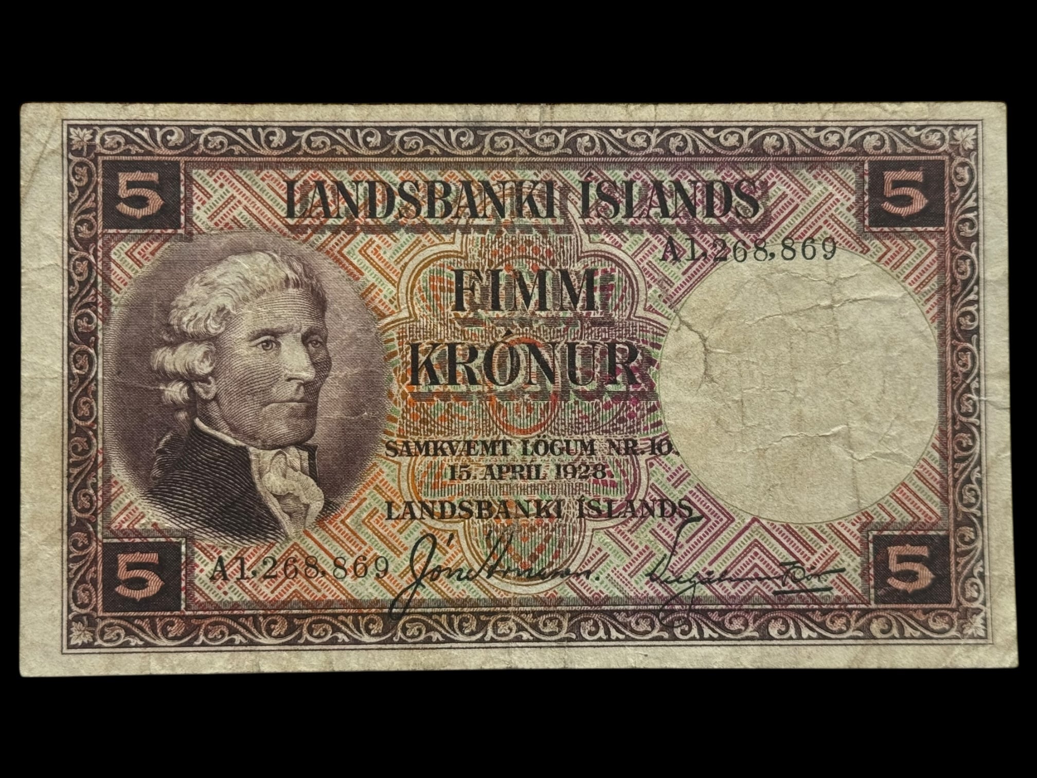 Island, 5 kronur 1935 A, Nr. A1268869, Sieg 33, Pick 27, Kva. 1-1+ revne
