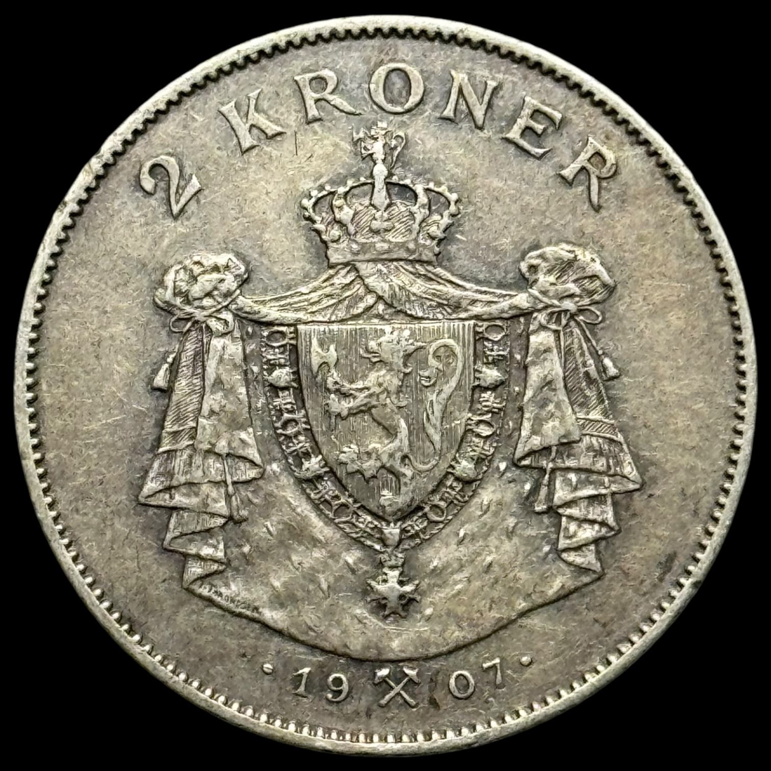 Norge, 2 krone 1907 “Sværd og gevær”, Haakon VII, Sieg 71, NM 5, Kva. 1+