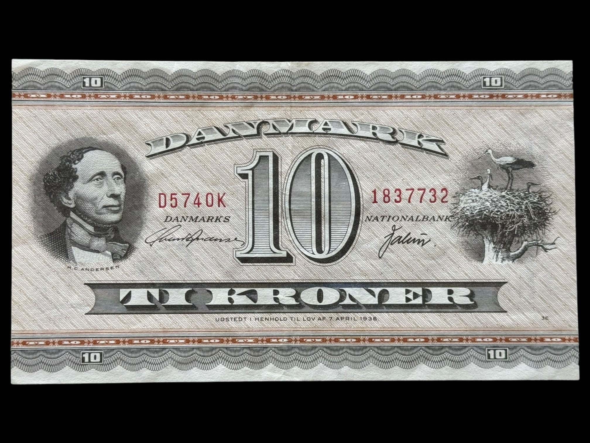 10 krone 1974 D5, 0K, Svend Andersen/Valuer Kva. 01 “Meget Sjælden erstatningseddel”