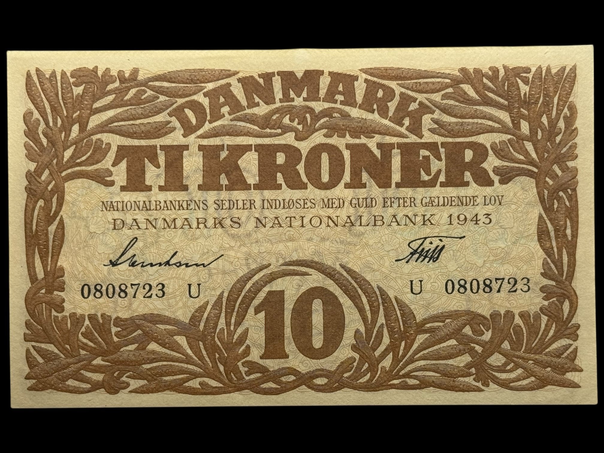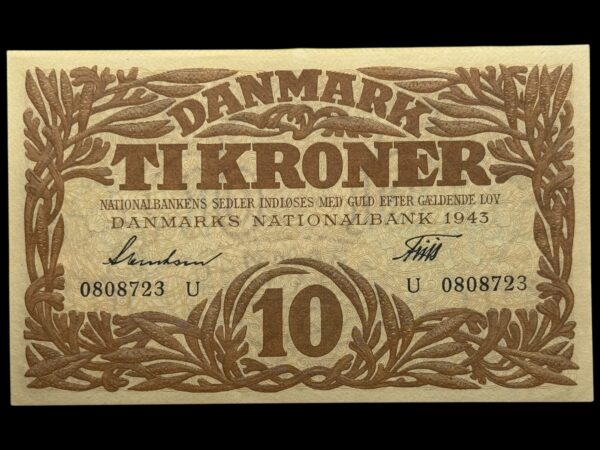 10 kroner 1943 U, Svendsen/Friis, Nr. 0808723, Sieg 105, DOP 124, Pick 31, Kva. 0
