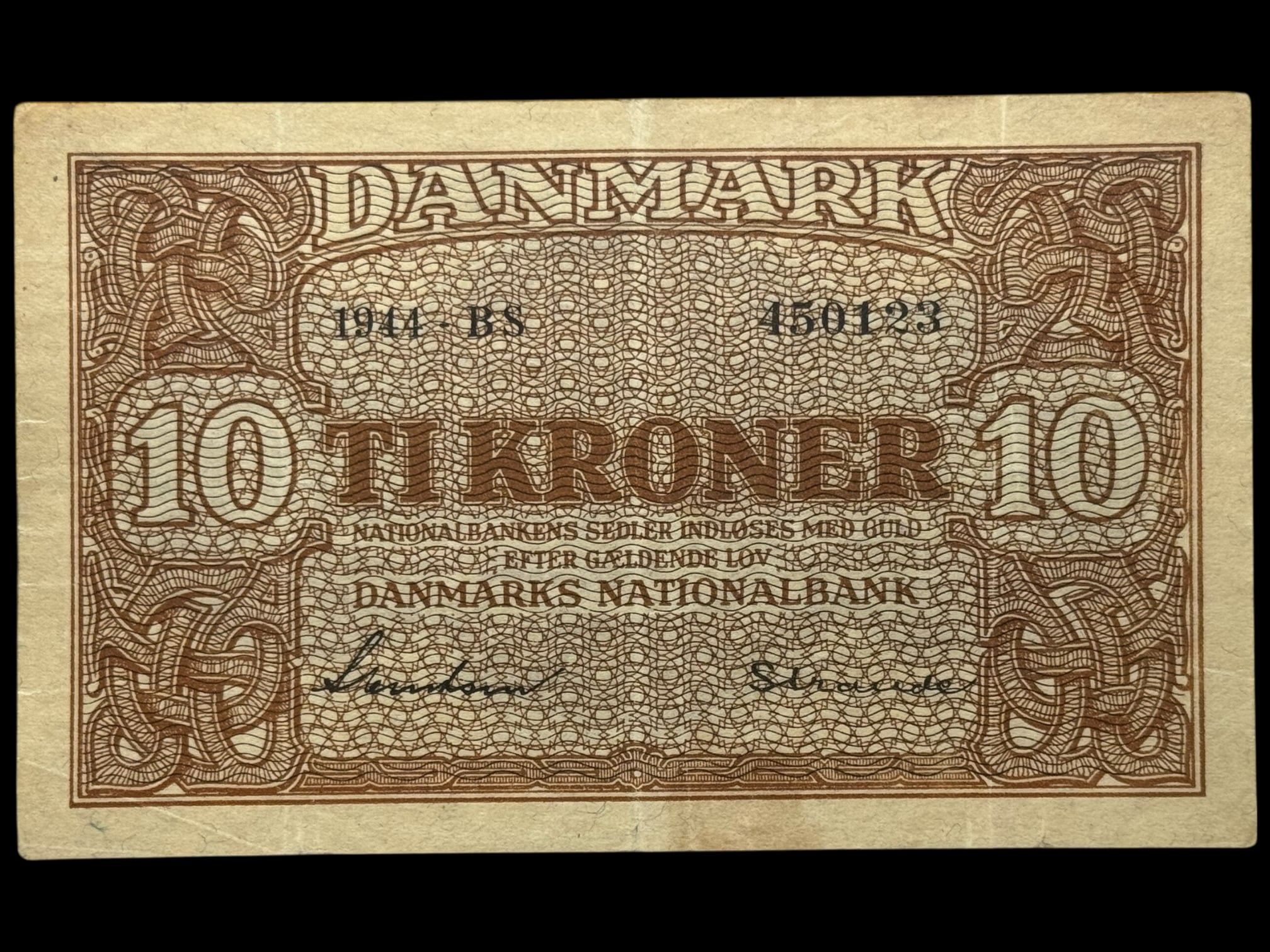 10 kroner 1944 BS, Svendsen/Strande, Nr. 450123, Sieg 120, DOP 129, Pick 36, Kva. 1+