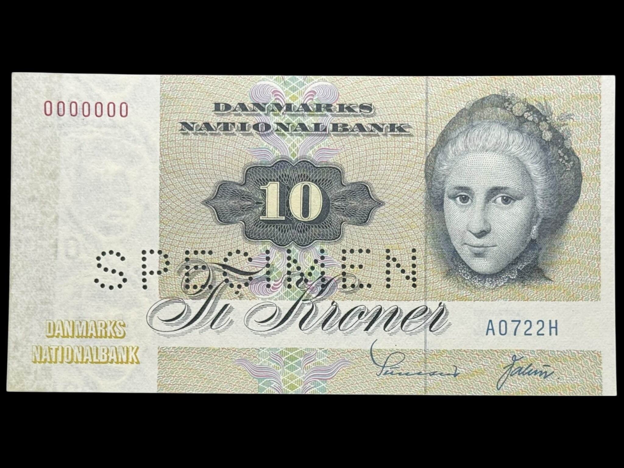 10 kroner 1972 A0, Valuer/Sunesen, Nr. 0000000, Sieg 139, DOP 148, Pick 48, SPECIMEN, Kva. 0-01 “Beskidt i venstre side” Sjælden
