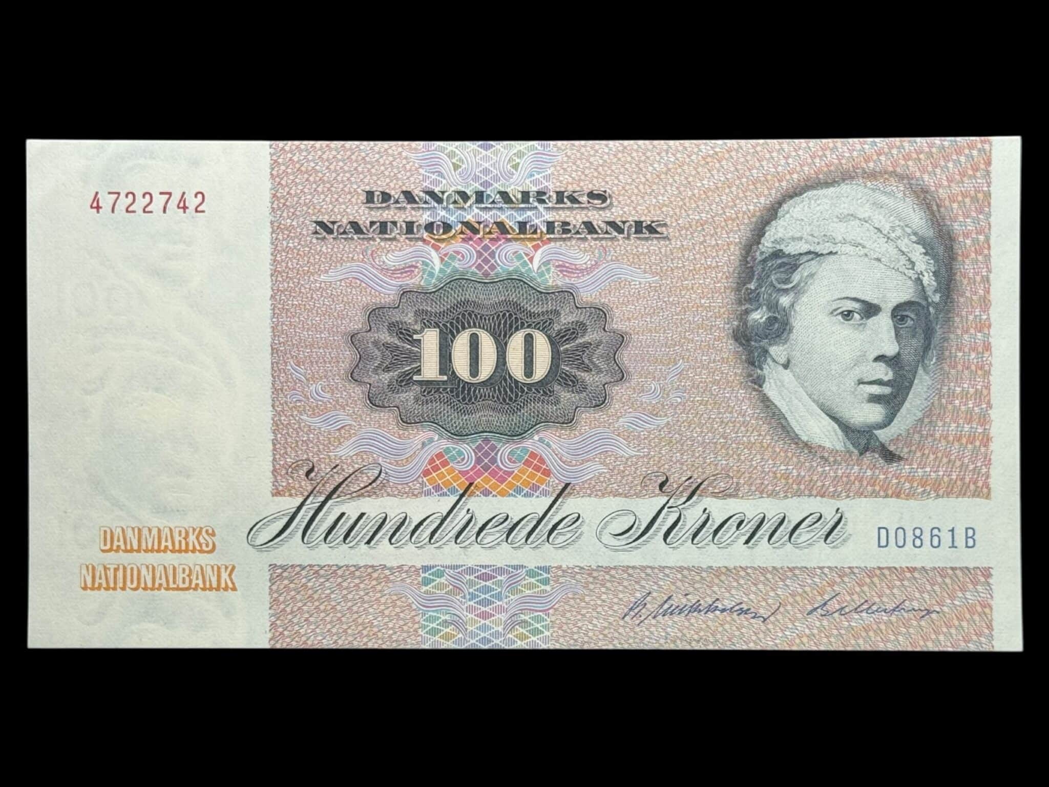 100 kroner 1986 D0, Billestrup/R. Mikkelsen, Nr. 4722742, Sieg 142, DOP 151, Pick 51, Kva. 0