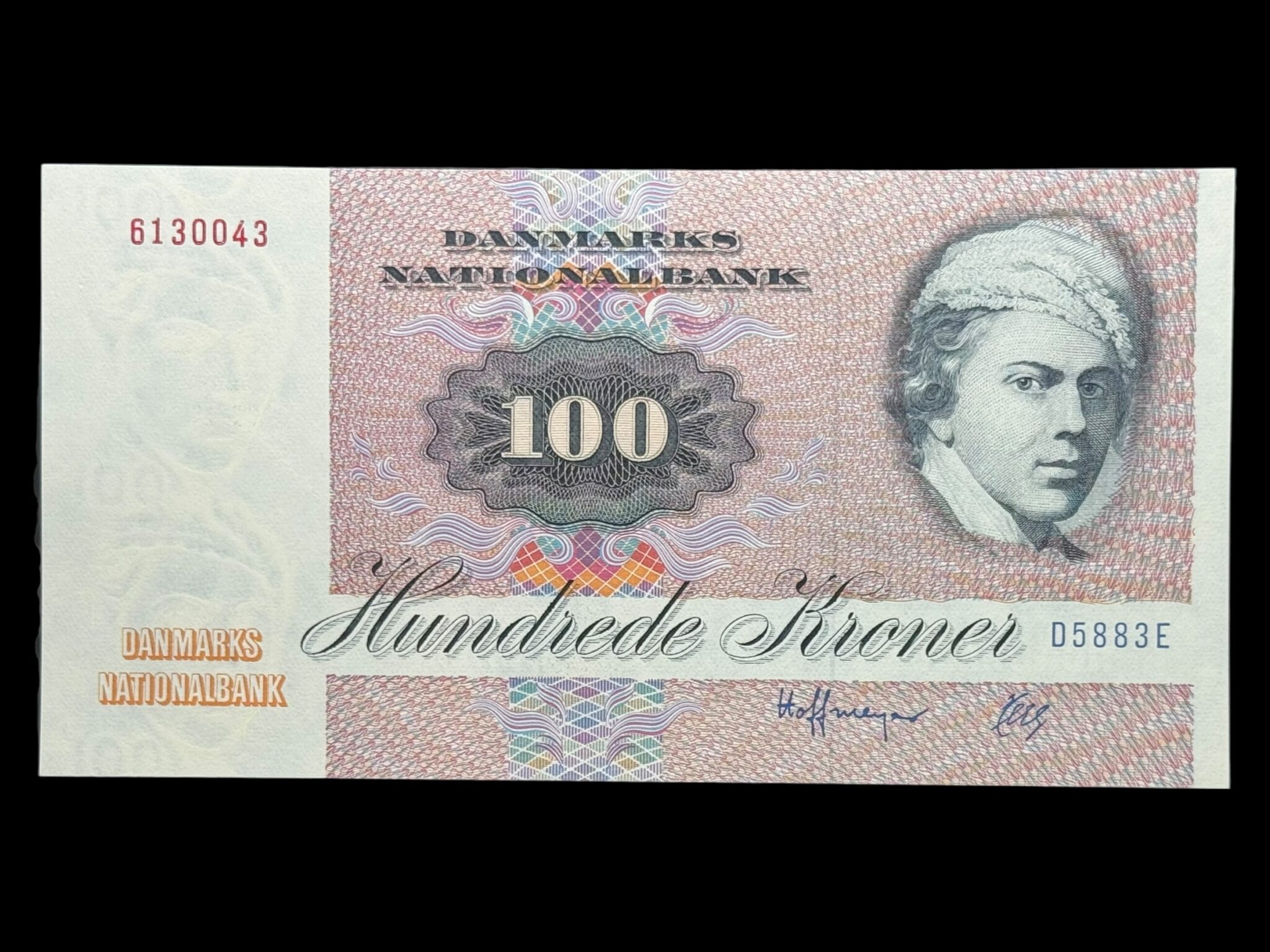 100 kroner 1988 D5, Herly/Hoffmeyer, Nr. 6130043, Sieg 142, DOP 151, Pick 51, Kva. 0
