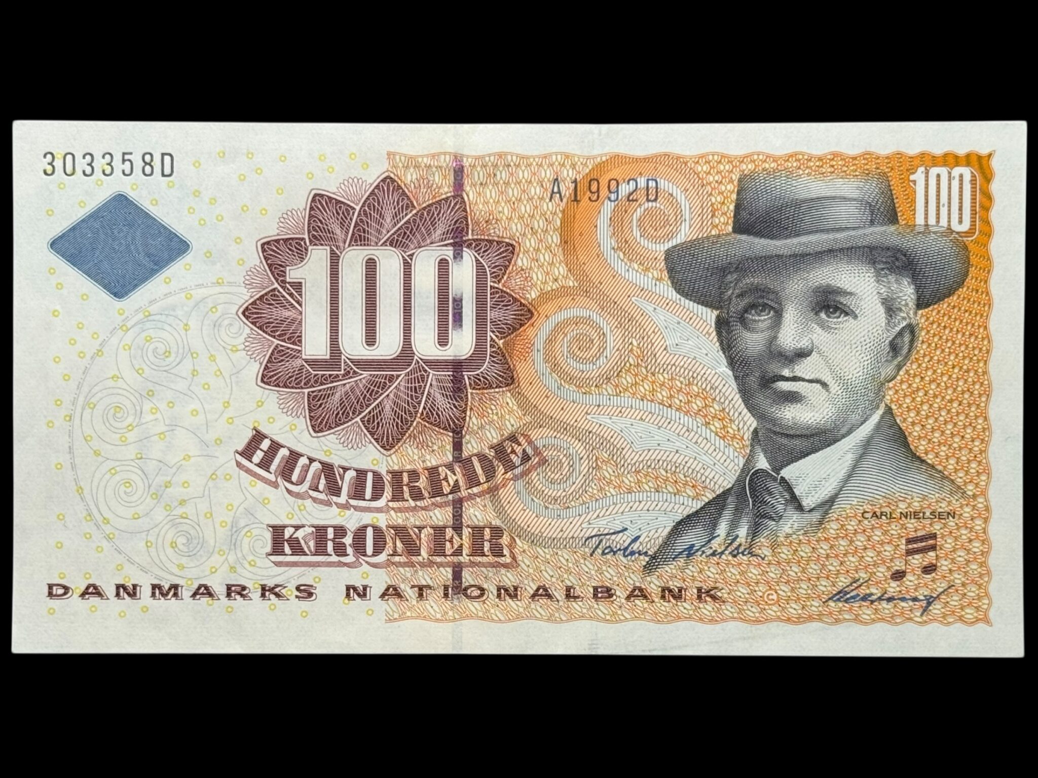 100 kroner 1999 A1, Heering/Torben Nielsen, Nr. 303358D, Sieg 147, Pick 56, Kva. 0