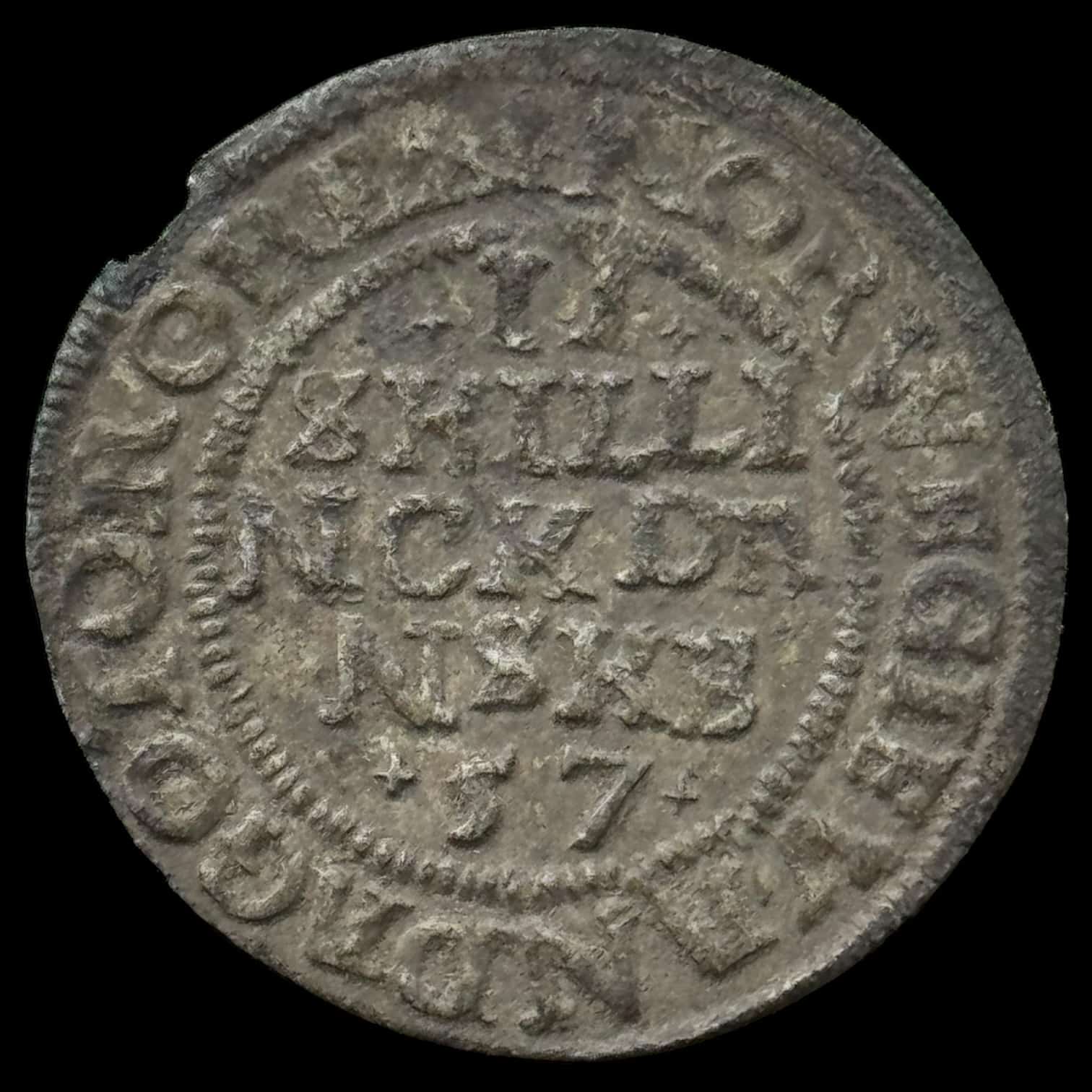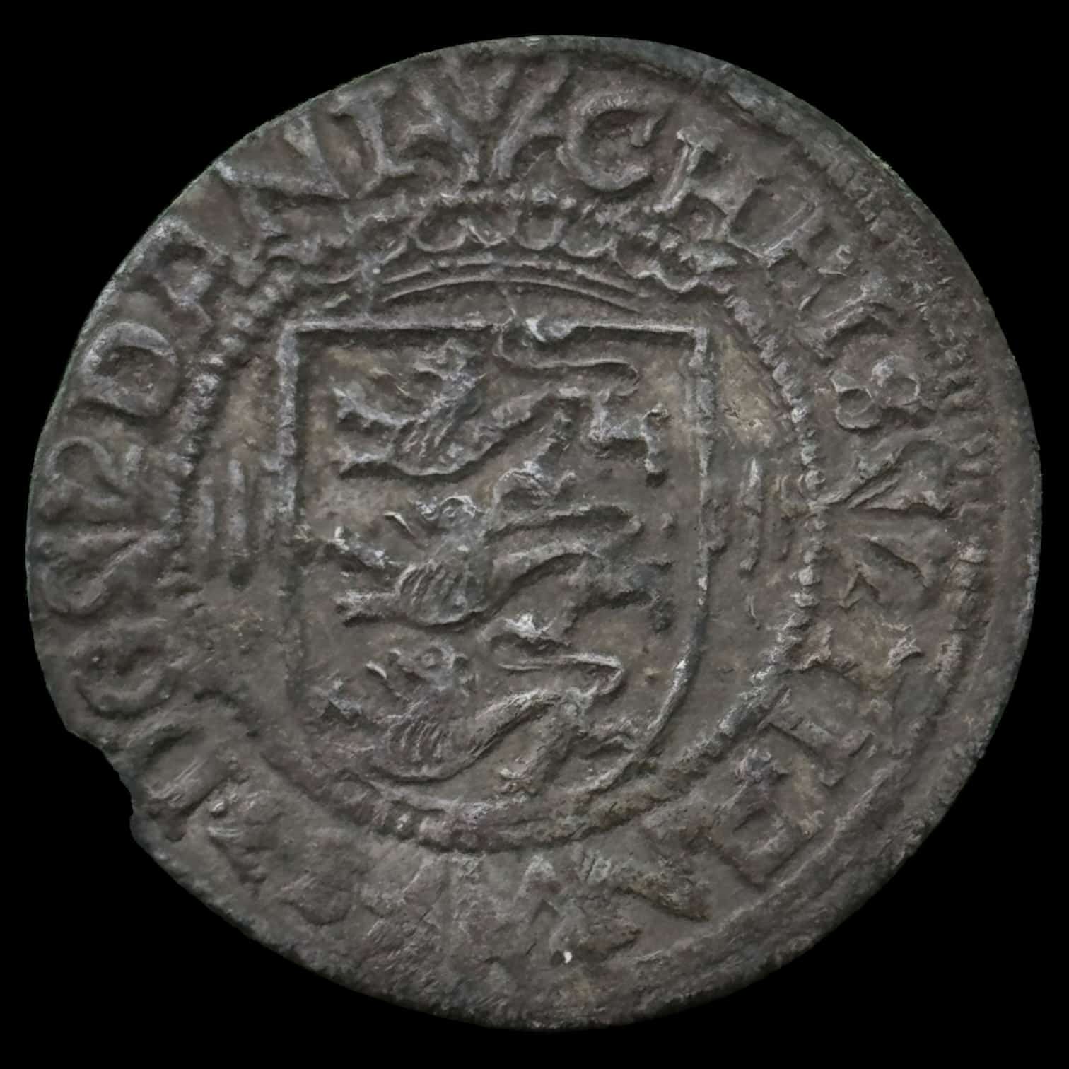 1557, 2 skilling, Chr.lll, Sieg 34, Hede 10, Kva. 1+ “kantmangel, Korroderet”