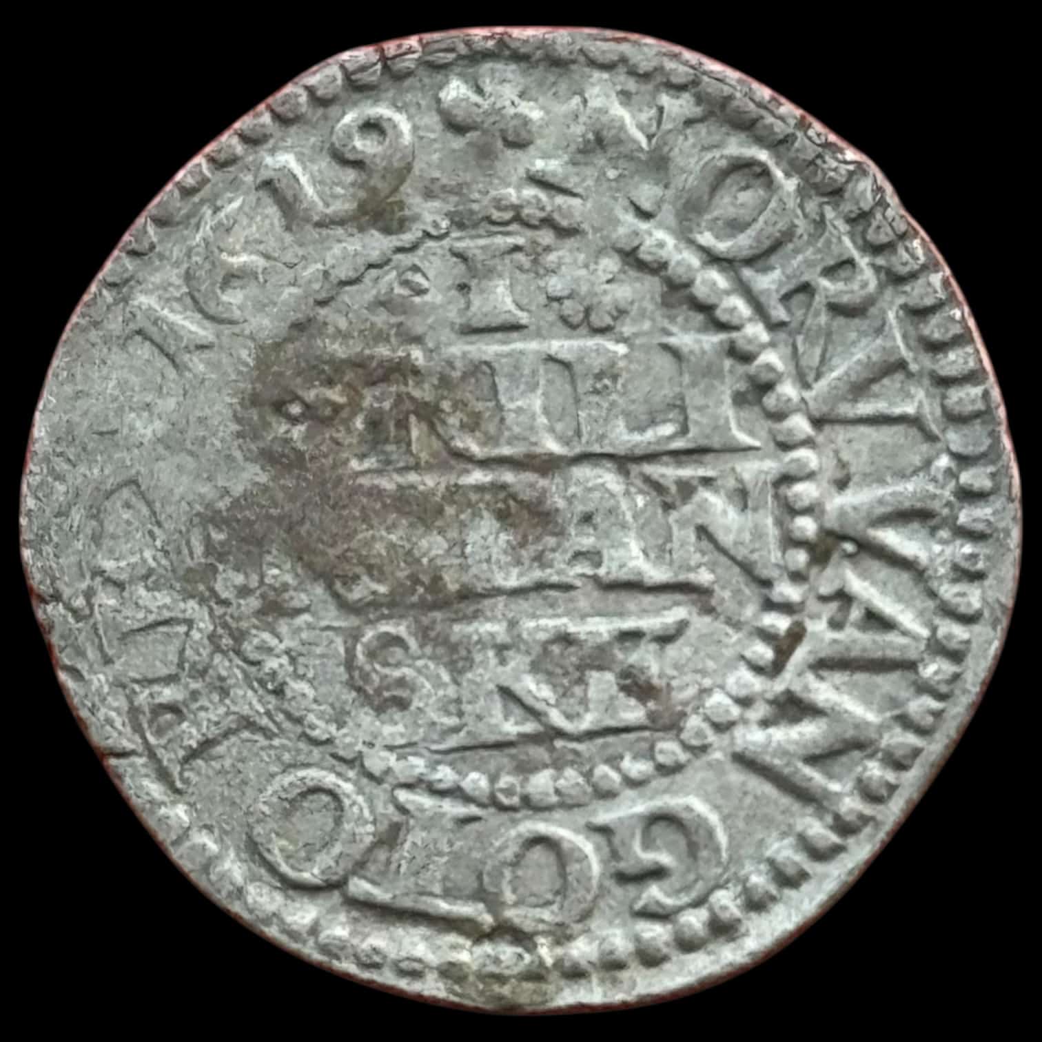 1619, 1 skilling, Chr.IV, Sieg 21.10, Hede 80G, Kva. 1+-1 “Ex. Preben Nielsen DNF 502, 2015, lot 245” Uhyre sjælden “nævnt i siegs 2018”