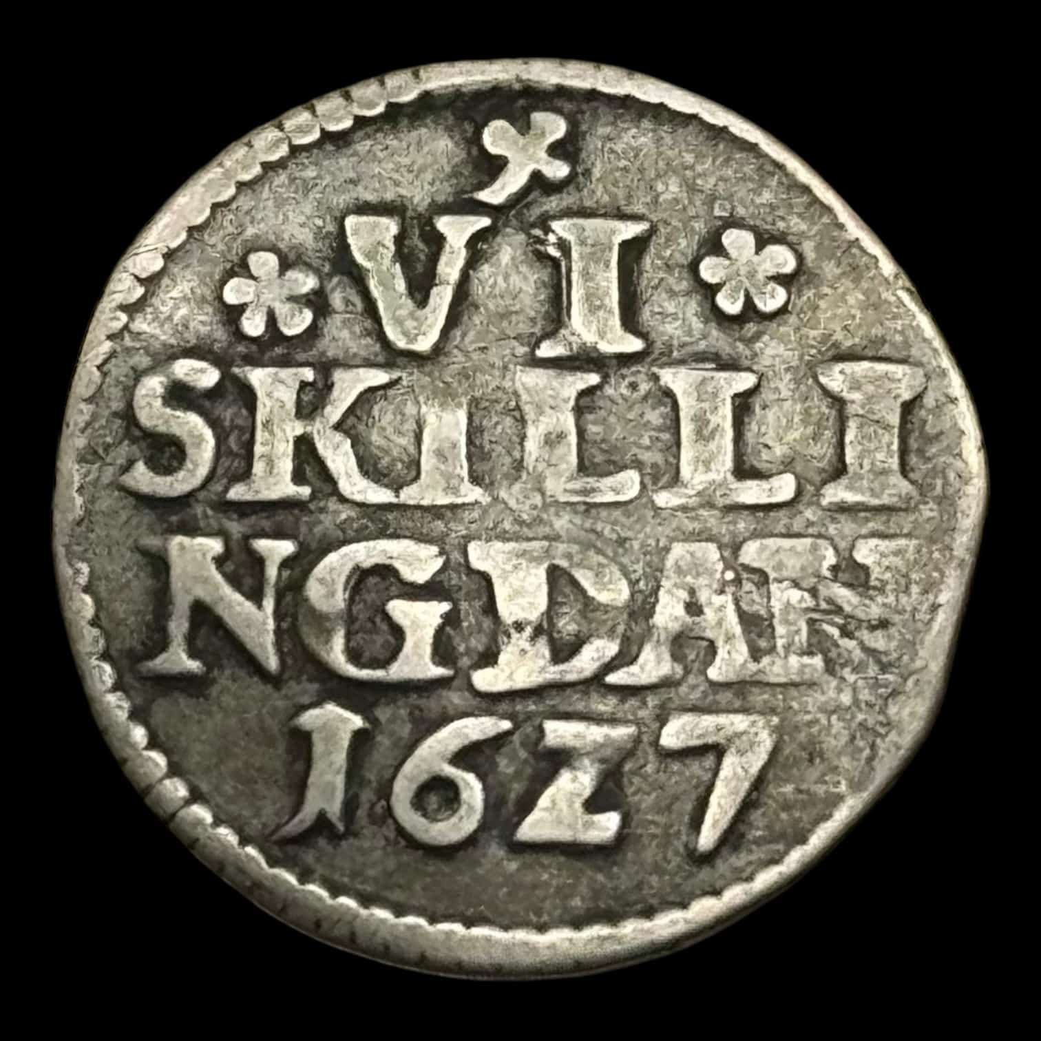 1627, 6 skilling Chr.lV, Sieg 49.1 Hede 139A, Kva. 1 “Uhyre sjælden”