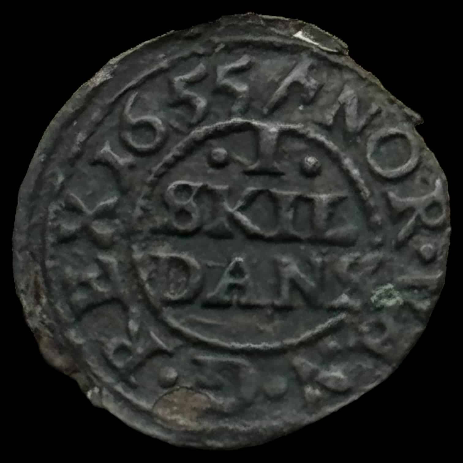 1655, 1 skilling Fre.lll Kva. 1+ “Meget Sjælden”