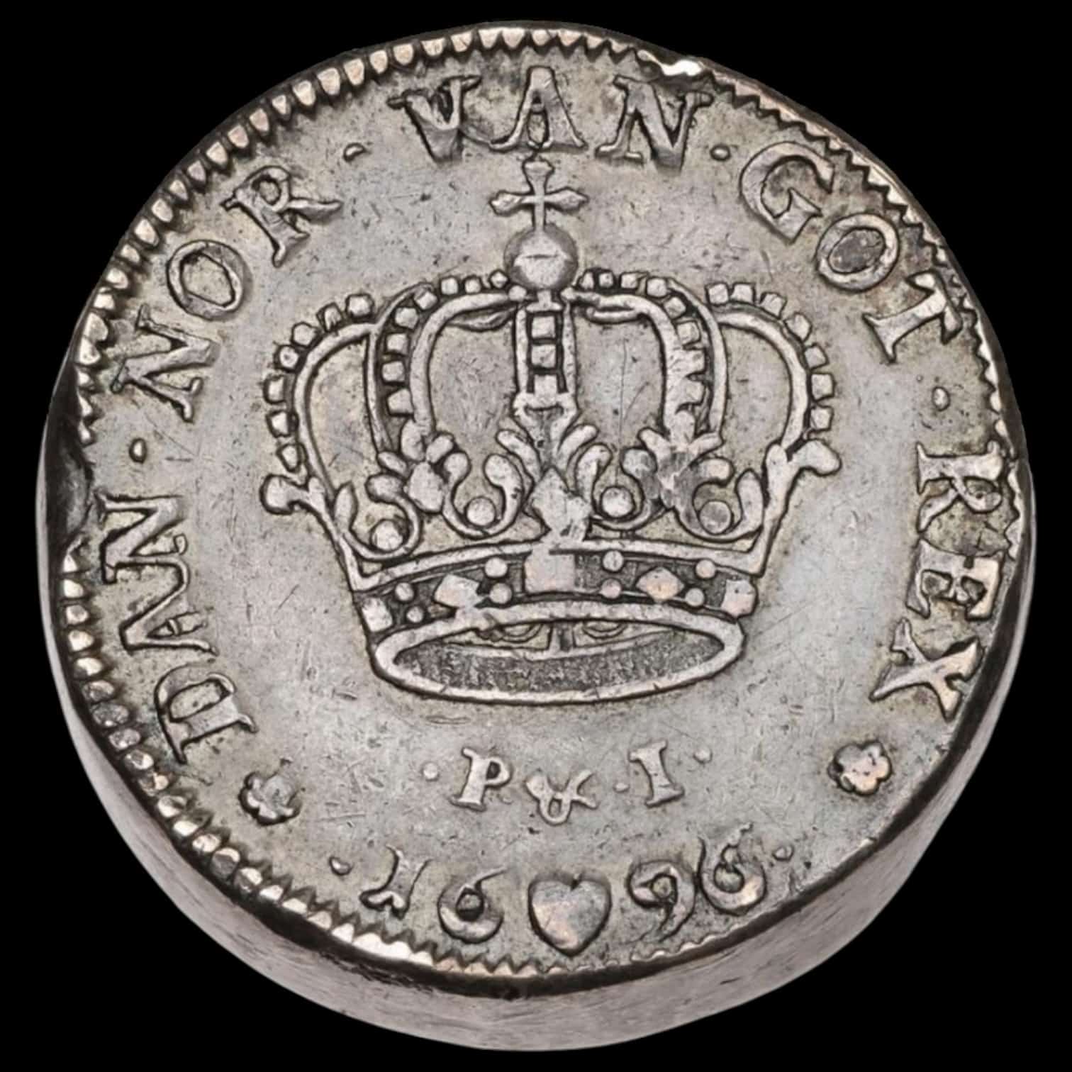 1696, 2 krone “klumpkrone”, Chr.V, Sieg 25, Hede 105, Schou 24, 36,25 gram, Kva. 1+, fint eksemplar af dette særdeles sjældne årstal af Meybuschs morsomme dobbelte “klumpkrone”
