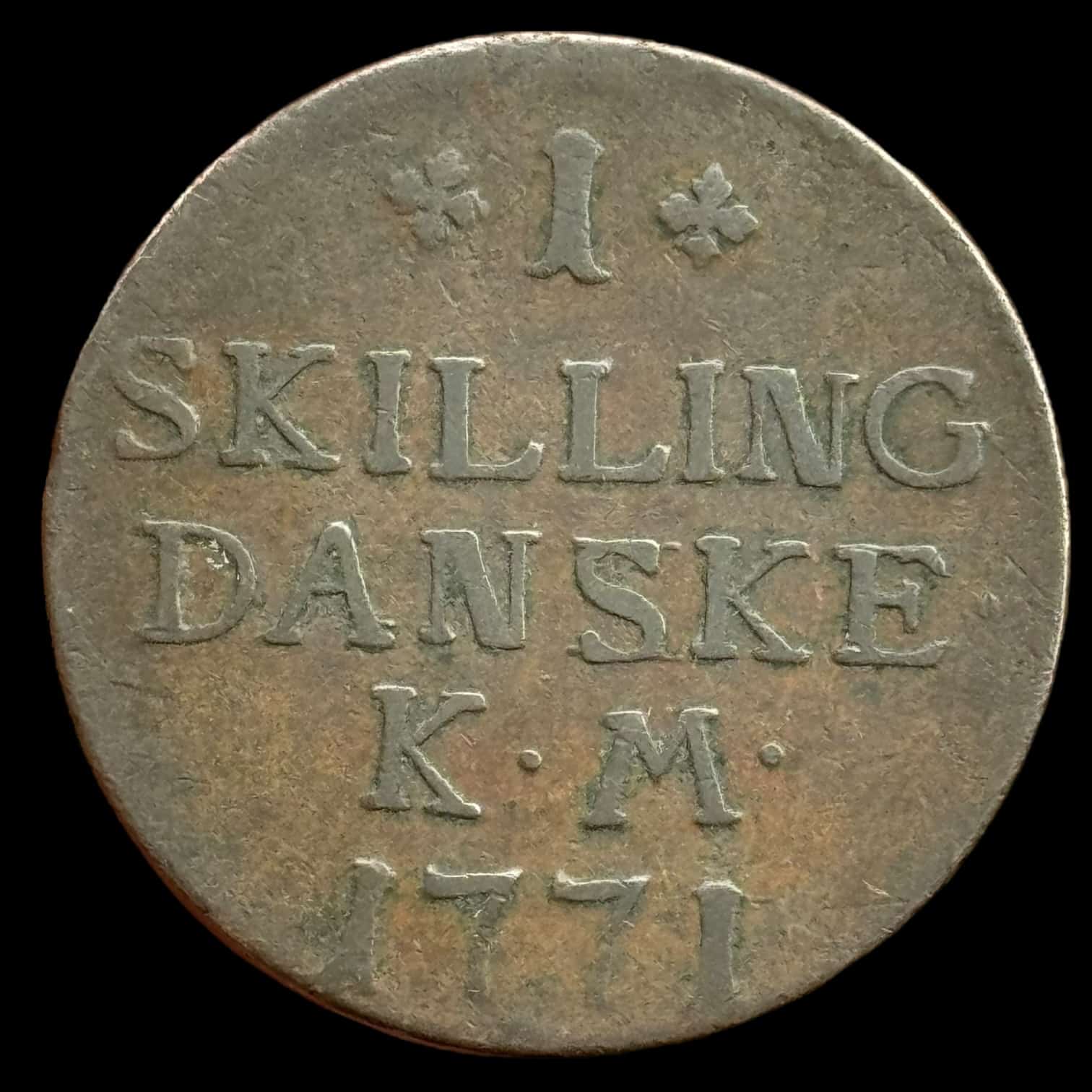 1771, 1 skilling, Chr.VII, Sieg 2.1, Hede 37, Kva. 1, interessant stempelskærerfejl med rettet S i DANSKE, Ex. BR online 2211/5079,