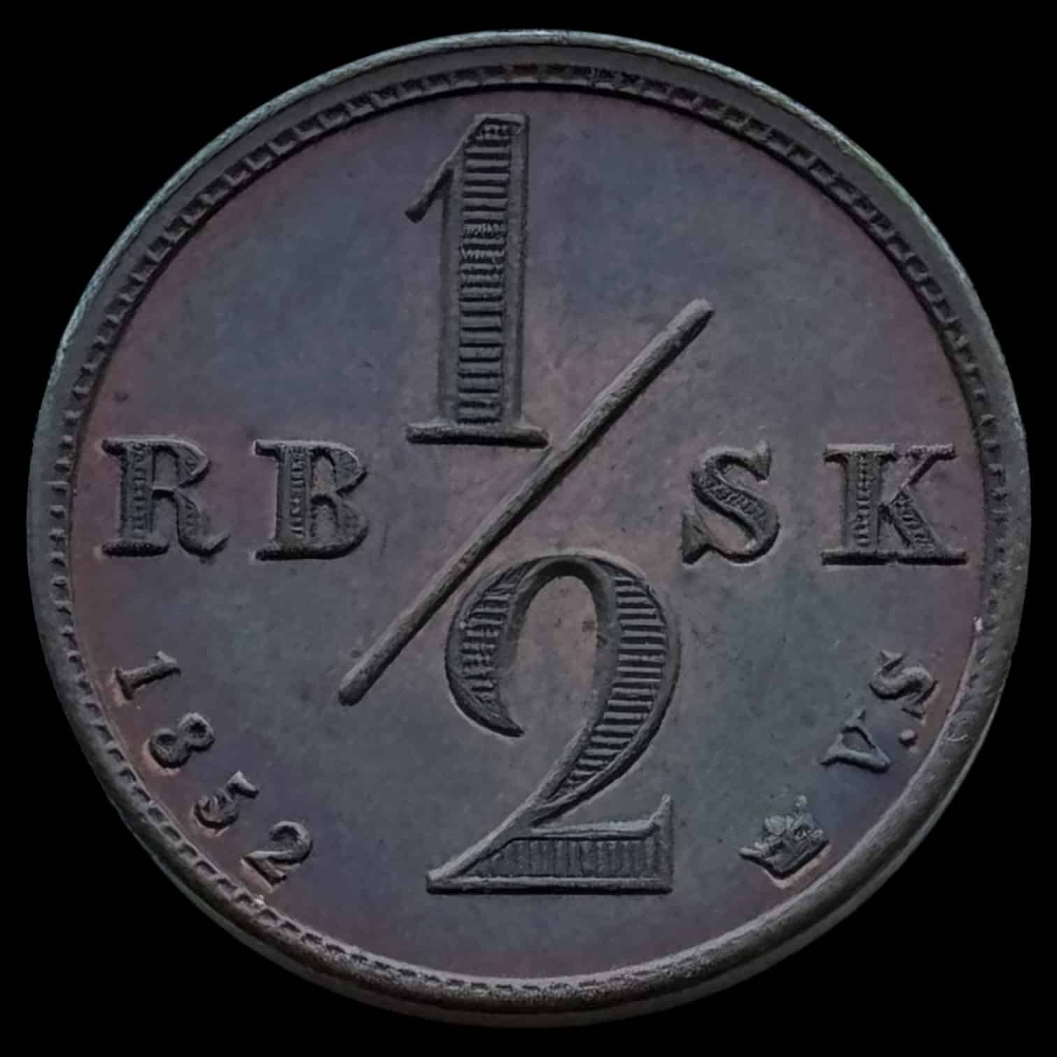 1852 VS, 1/2 rigsbankskilling, Fre.VII, Sieg 1, Hede 13, Kva. 0 “Ex. Bent Petersen”