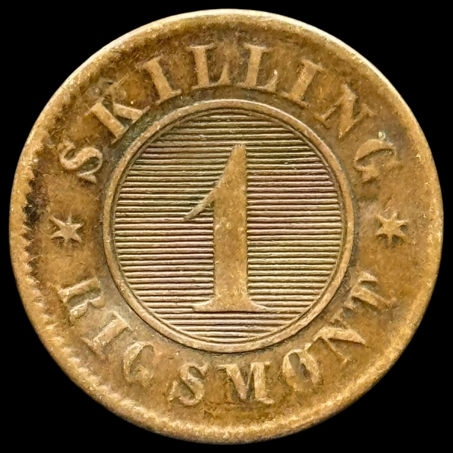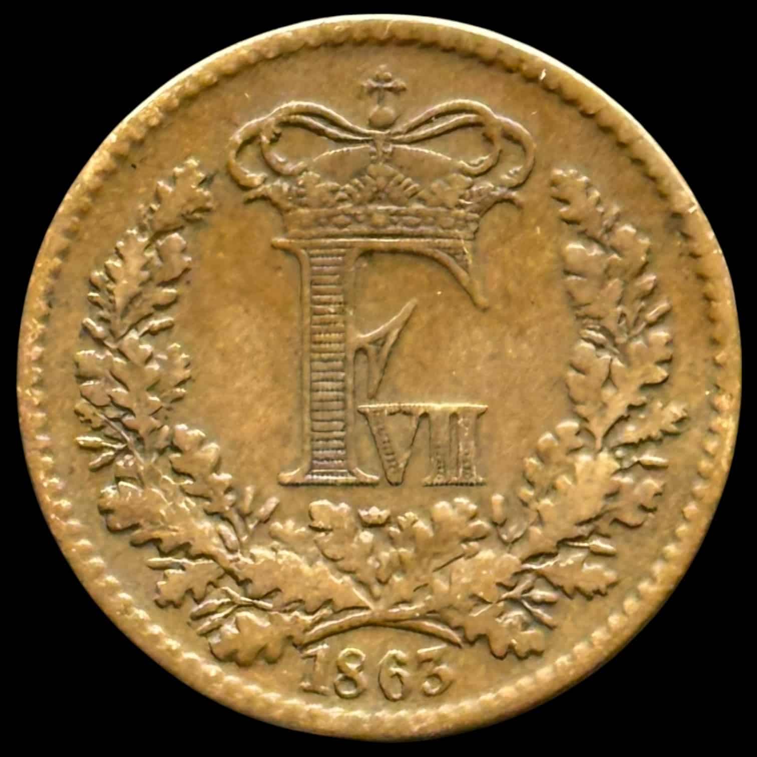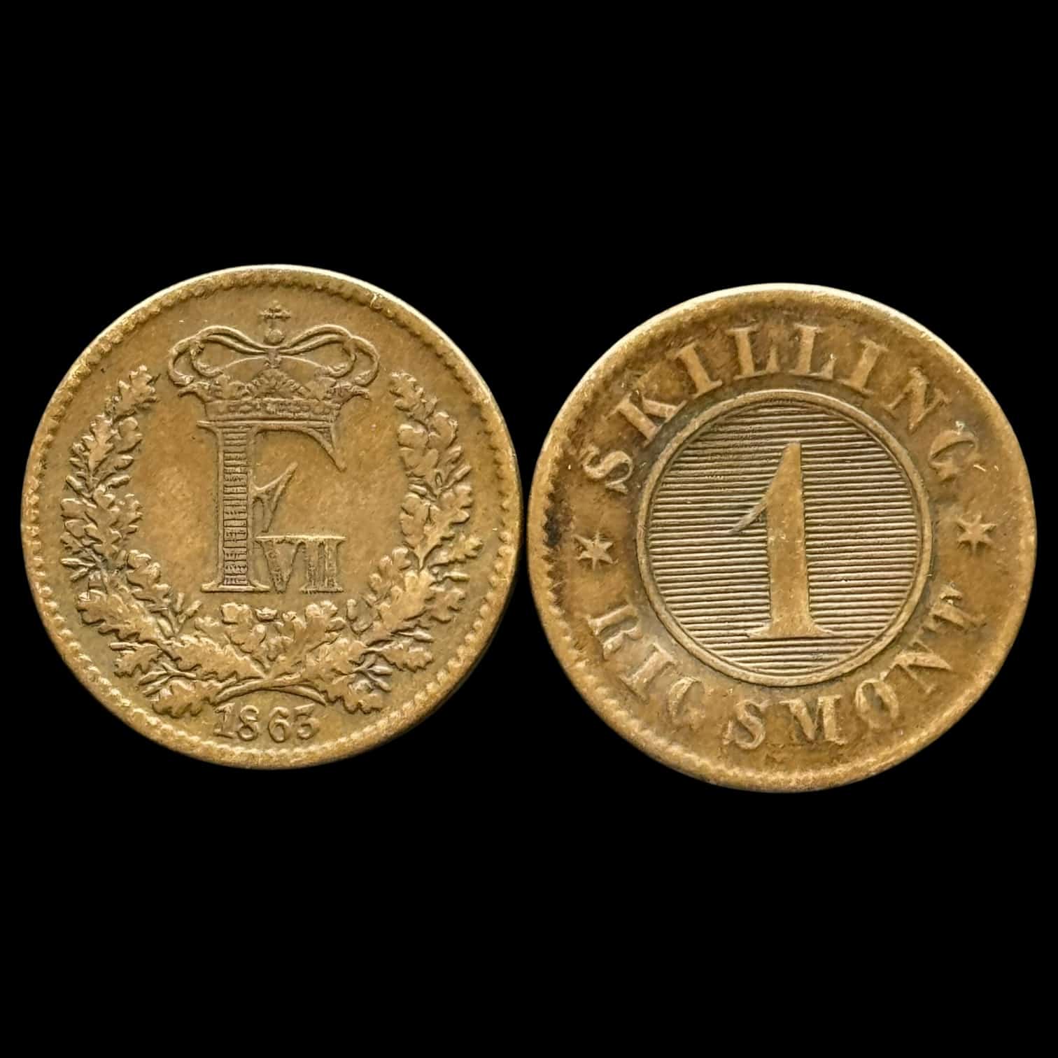 1863, 1 skilling, Fre.VII, omgjort til en spion mønt, Sieg 9.1, Hede 16A, Kva 1-1+