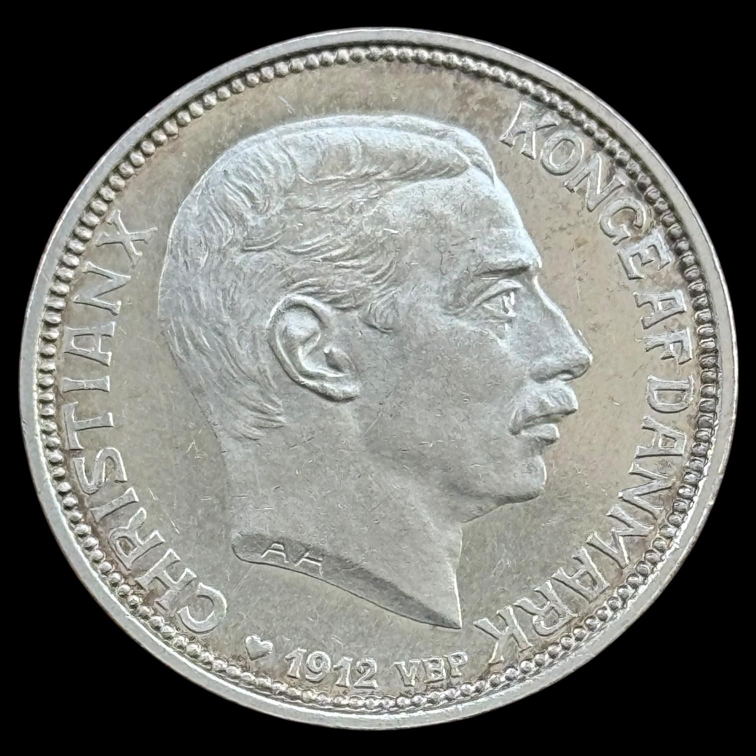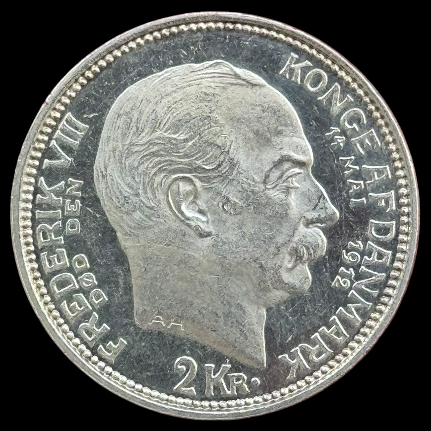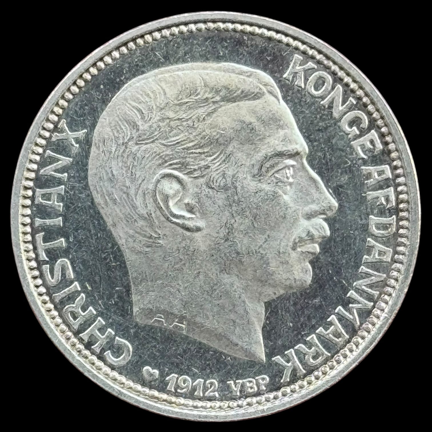 1912, 2 krone “Tronskifte Fre.VIII – Chr.X, Sieg 5, Hede 3, Kva. M-0 “Håndteringsspor”