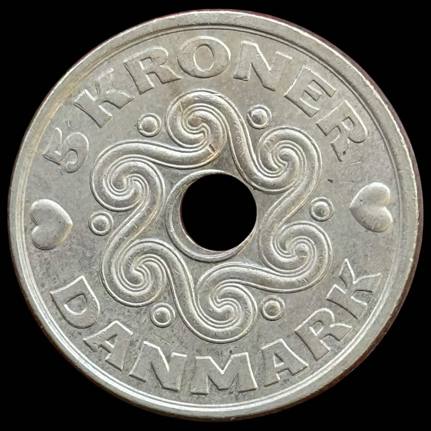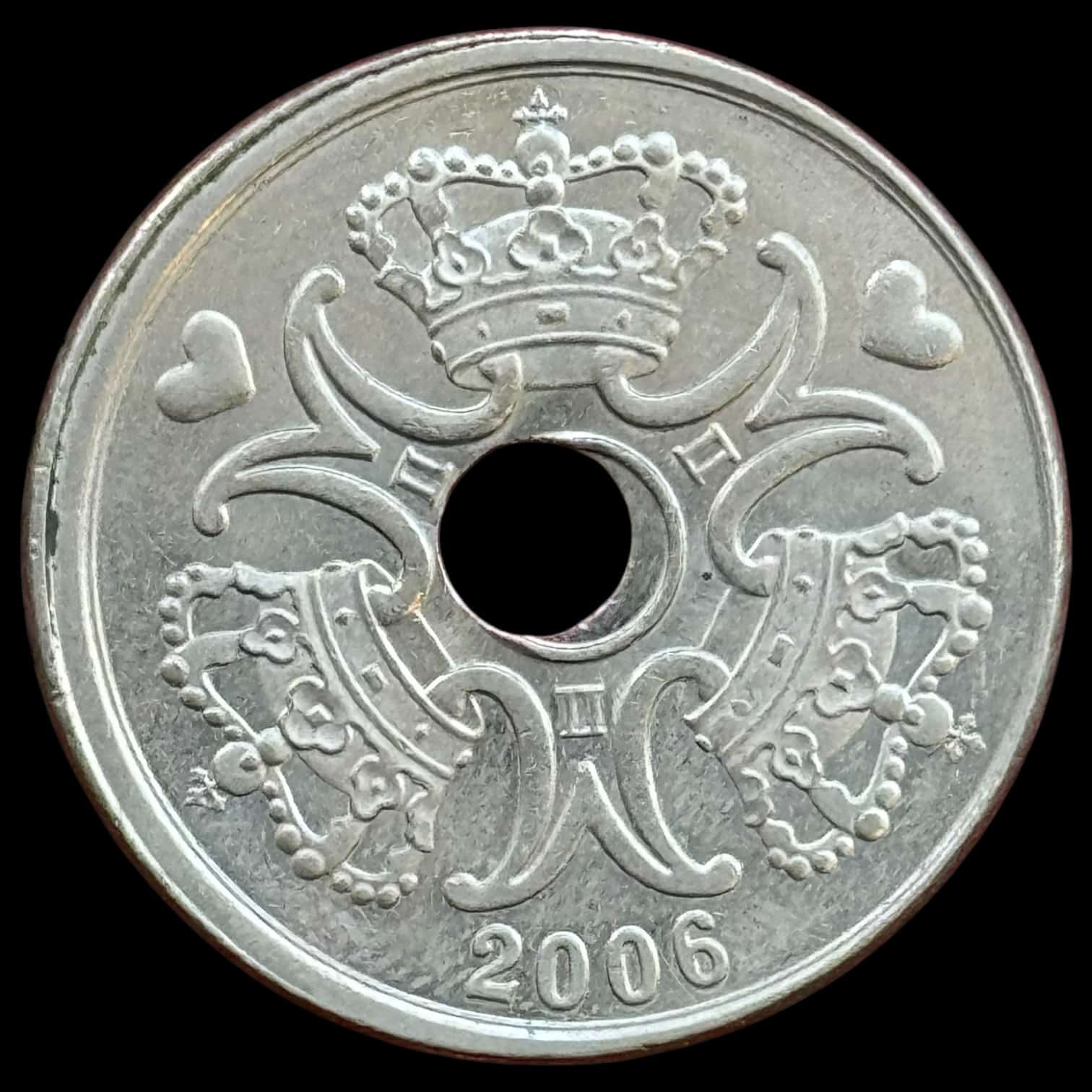 2006, 5 kroner, Margrethe ll, Sieg 3.2, Kva. 01 “Fejlpræg” Skævt præget hul