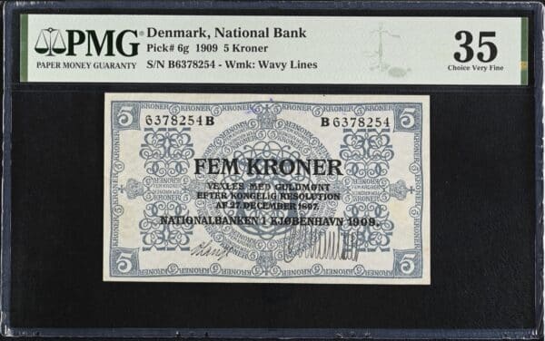 5 kroner 1909 B, V.Lange/Clemmensen, Nr. 6378254, Sieg 93, Pick 6g, DOP 102, Kva. 01, PMG 35 Choice Very Fine, Annotation TOP POP
