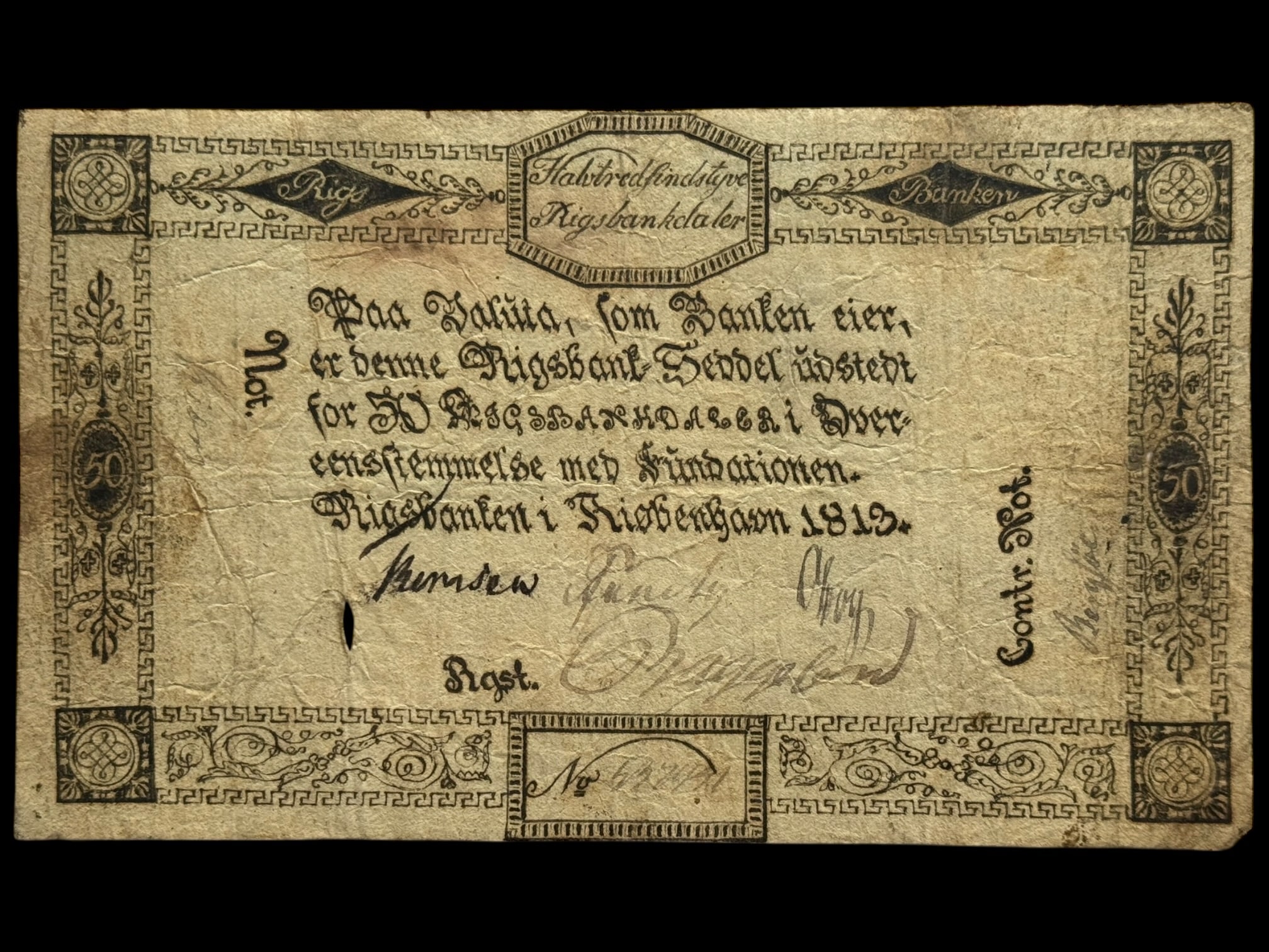 50 Rigsbankdaler 1813, Nr. 537941, Sieg 68, Pick A51, DOP 61, Kva. 1-1- “små papirgennembrud, samtidig forfalskning”