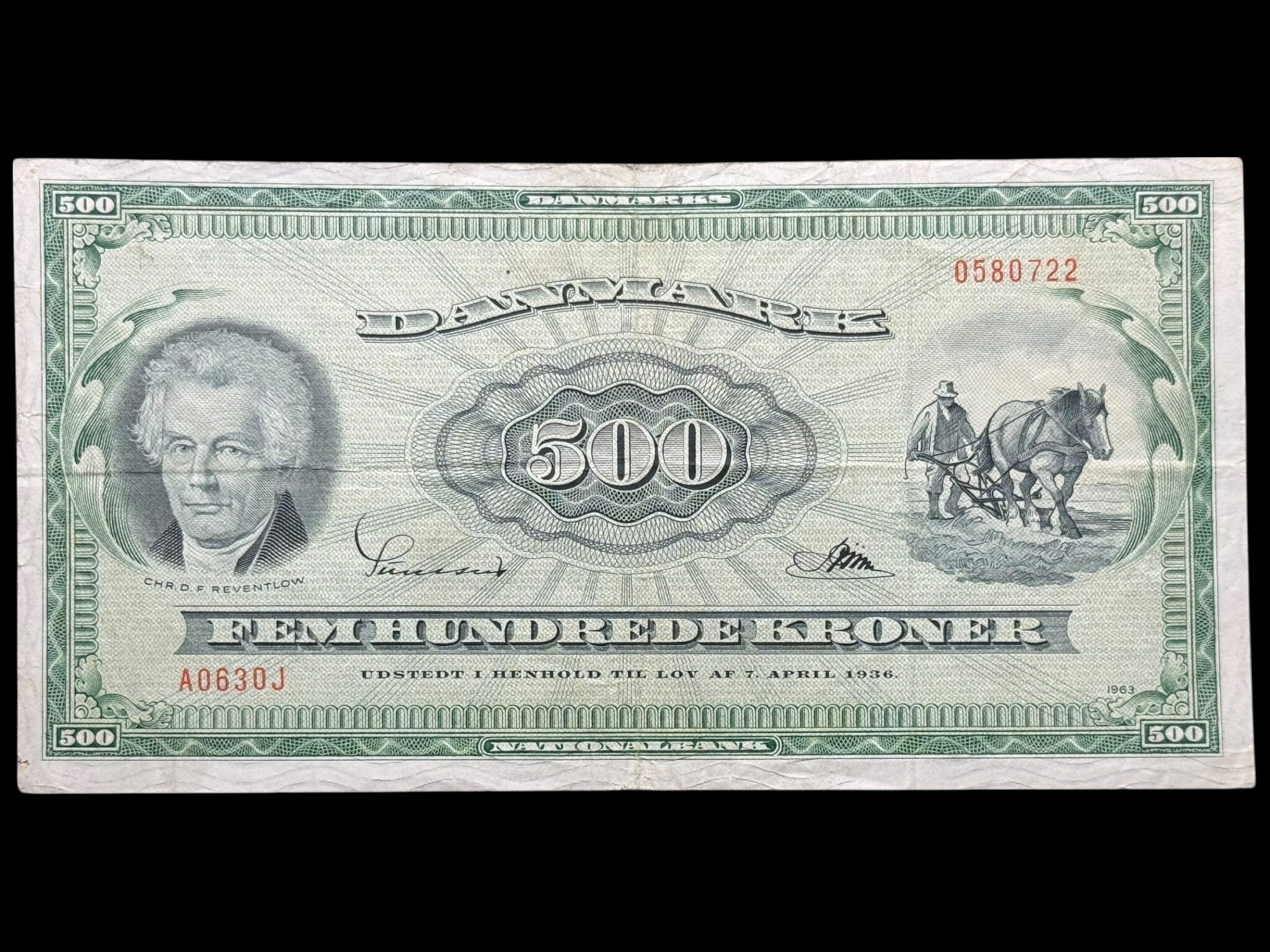 500 kroner 1963 A0 0J, Riim/Sunesen, Nr. 0580722, Sieg 138, DOP 147, Pick 47, Kva. 1-1+
