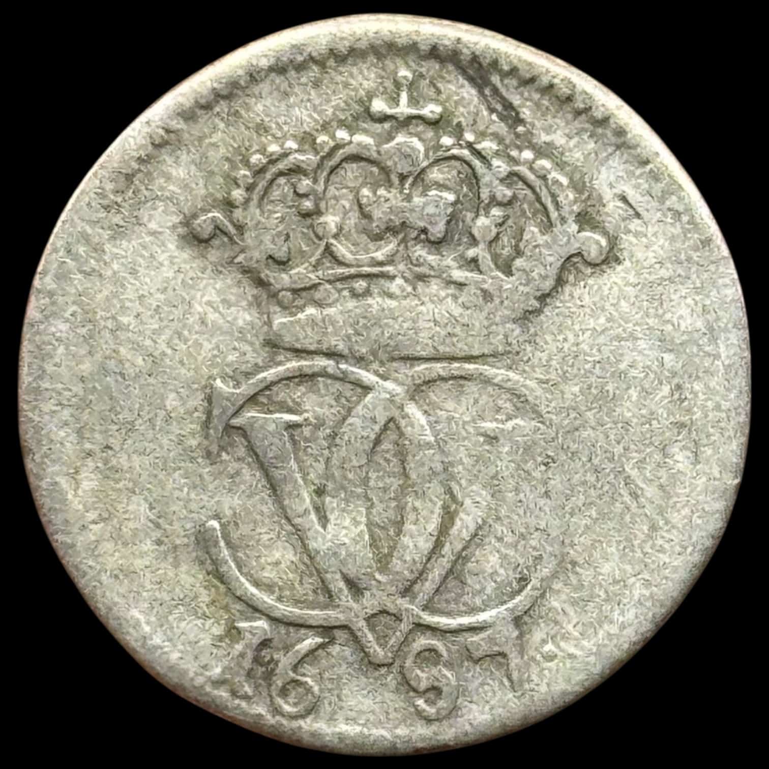 Norge, 2 skilling 1687, “årstal på forsiden”, Chr.V, Sieg 16.1, Hede 71B, NM 228, Kva. 1, “sjælden”