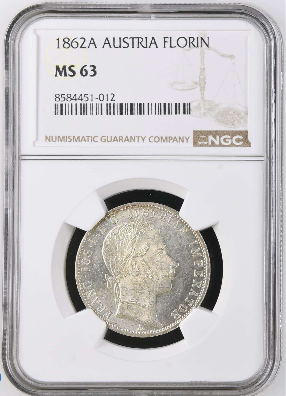 Østrig / Austia, Florin 1862 A, Joseph I, KM 2219, Kva. 0, Graderet MS 63 af NGC
