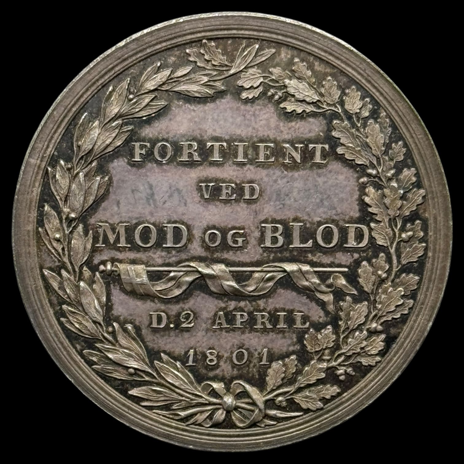 Sølvmedalje, Mindesmærket på Holmens Kirkegård, 1804, Loos, B 40, Sommer A 116, 37 mm, 13,57 g – fint patineret eksemplar af denne mindemedaille over de faldne i slaget på Reden d. 2. april 1801, Kva. 0-01
